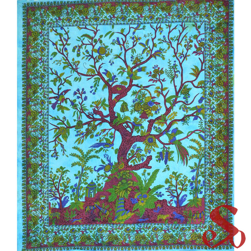 Tenture Indienne 100% coton Arbre de vie vert et turquoise 220 x 240 cm