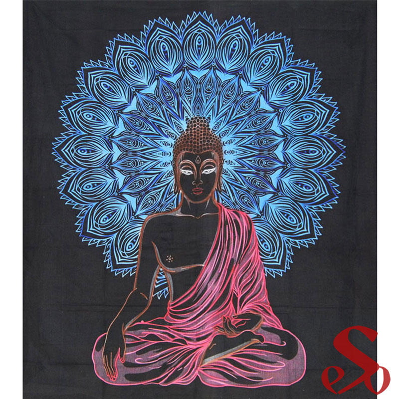 Tenture Indienne 100% coton Bouddha rose et bleu sur fond noir 220 x 240 cm