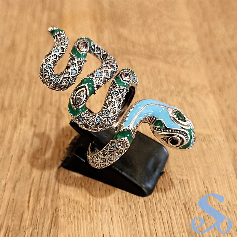 Bague ajustable serpent long en argent 925 et turquoise aventurine et obsidienne
