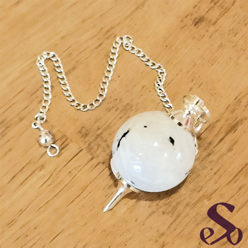 Pendule Sephoroton en Pierre de Lune, chaînette en métal argenté 20 cm.